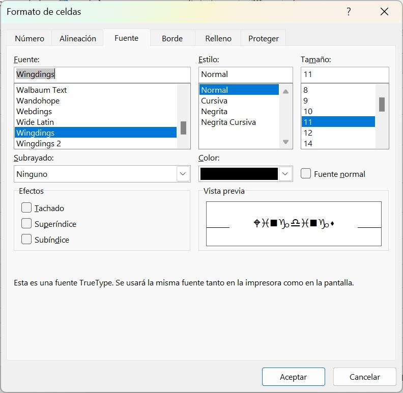 5. Busque la fuente “Wingding” en la lista de fuentes y selecciónela. Puede hacer los cambios necesarios en cuanto al tamaño de la fuente, el color, la sangría, etc.