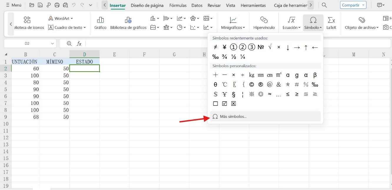 2. Vaya a la pestaña “Insertar” y seleccione Símbolo y haga clic en “Más Símbolos”.