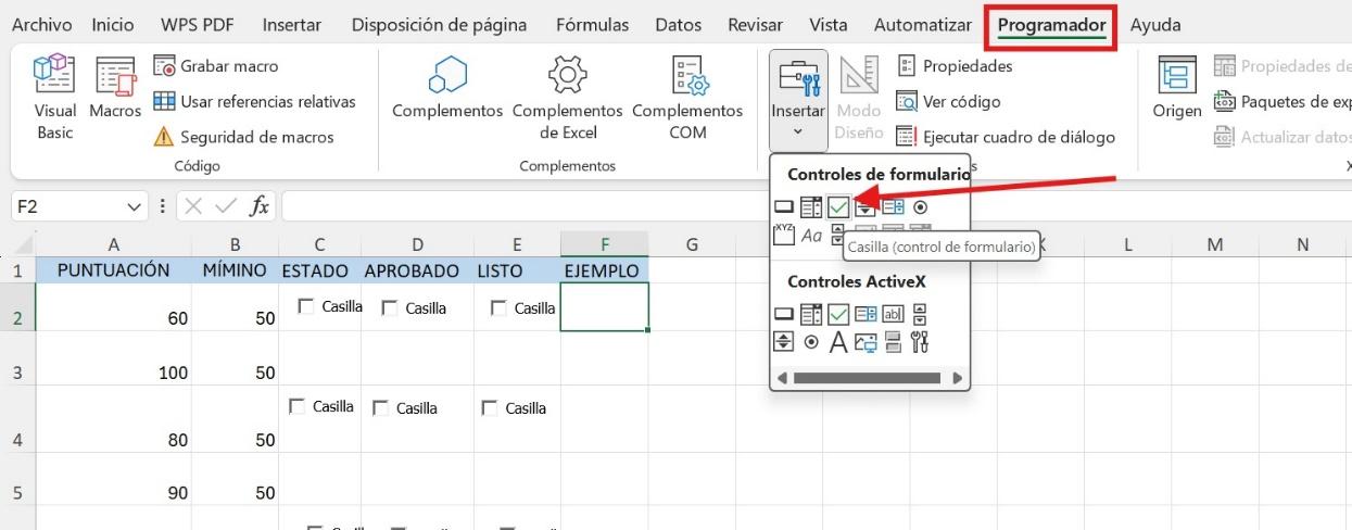3. Una vez activada la pestaña Programador, haga clic en ella y diríjase a Insertar. A continuación, seleccione Casilla de verificación de Controles.