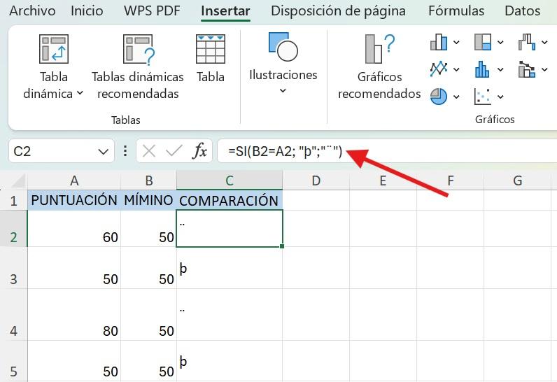 3. Ahora modificaremos la fórmula para obtener los resultados deseados. Cambie la salida a "þ" en caso de Verdadero y "¨" en caso de Falso. La fórmula queda como “=SI(B2=A2, "þ","¨")".