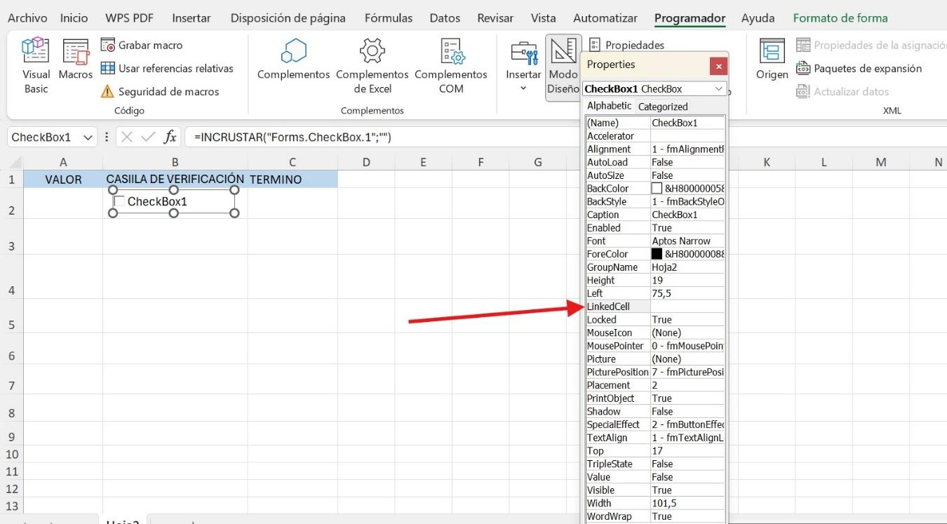 1. Primero, inserta una casilla de verificación desde la pestaña ActiveX. Vincúlelo con su siguiente columna que le dará salida en función de la entrada que haya introducido. Para ello, enlaza la casilla de verificación con la siguiente columna, tal y como lo muestra la captura de abajo.