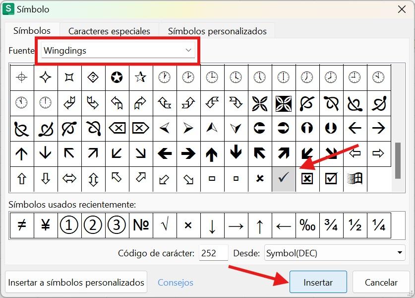 3. Luego que se abra una ventana, seleccione "Wingding" como Fuente. Desplácese hacia abajo hasta encontrar el símbolo de la marca de verificación (✓) y haga clic en él.
