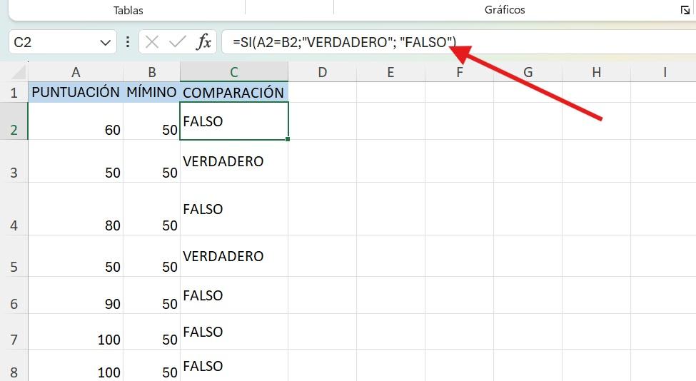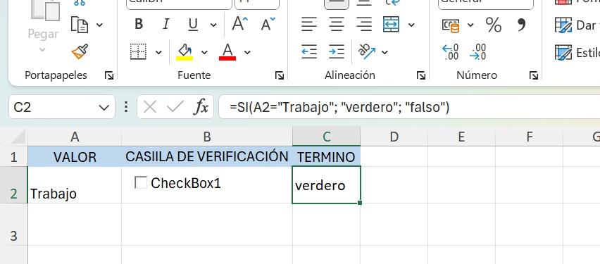 3. En la columna C, su resultado será Verdadero: =SI(A2="Trabajo"; "Verdadero"; "Falso")