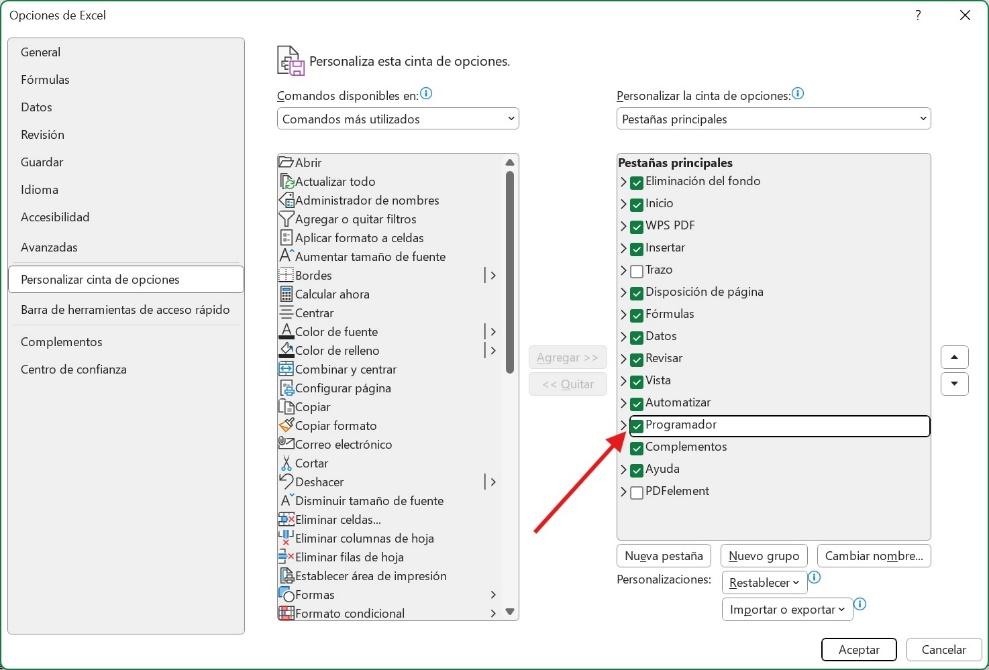 2. Para activar el modo Programador, siga esta ruta: Archivo → Opciones → Personalizar cinta → Programador.