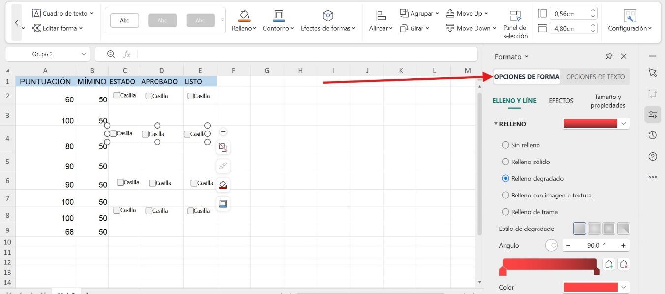 Entre las opciones puede encontrar cambiar el color, el tamaño y la línea: Los colores y las líneas le permiten cambiar el color de la casilla de verificación y sus líneas. Con el tamaño, usted puede aumentar el tamaño de las casillas de verificación en pulgadas. Además, existe opciones de texto para que pueda darle formato al texto a su gusto.