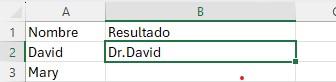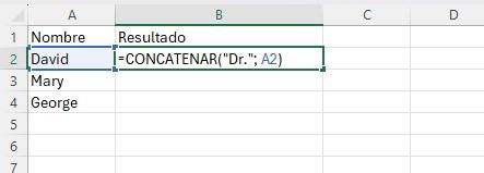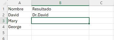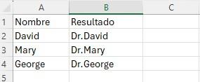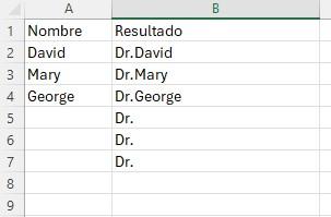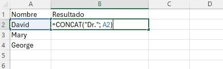 Las funciones CONCAT y CONCATENAR son muy útiles si usted desea añadir un determinado título al principio o al final de una lista. A continuación, le mostraré un ejemplo para añadir “Dr.” al principio de una lista de nombres.