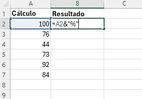 1. El operador & también puede utilizarse para añadir texto al principio o al final de muchas celdas. Veamos un ejemplo en el que es necesario añadir el símbolo de porcentaje (%) después de muchos números.