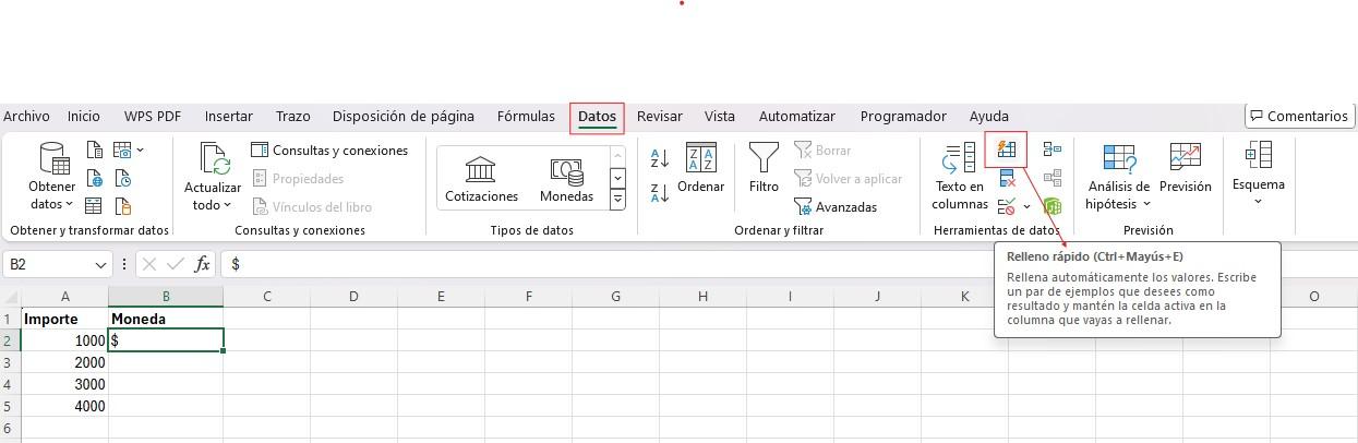 2. En la opción "Datos" del menú principal, hay un menú desplegable "Relleno" con la opción "Relleno Rápido".