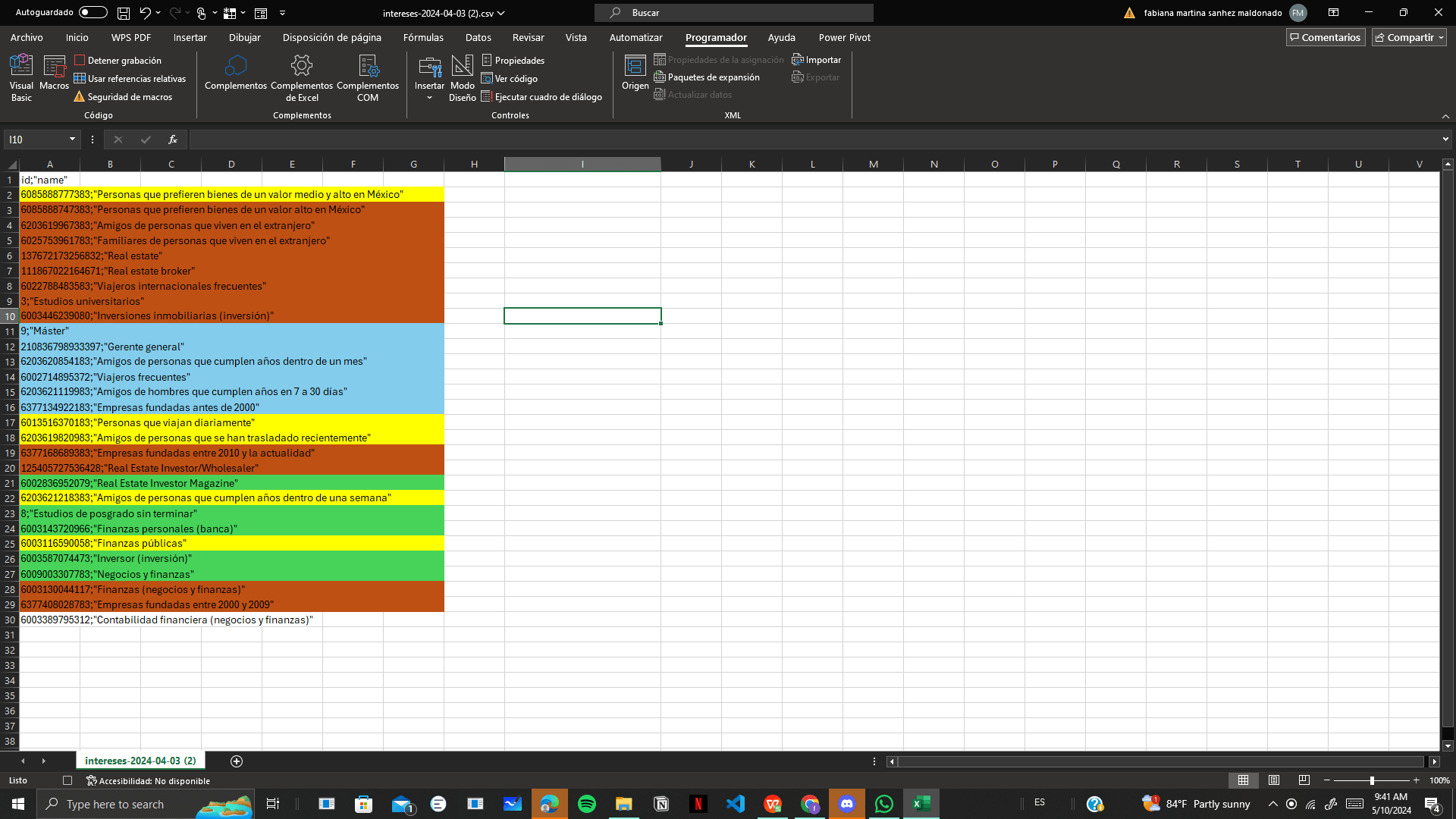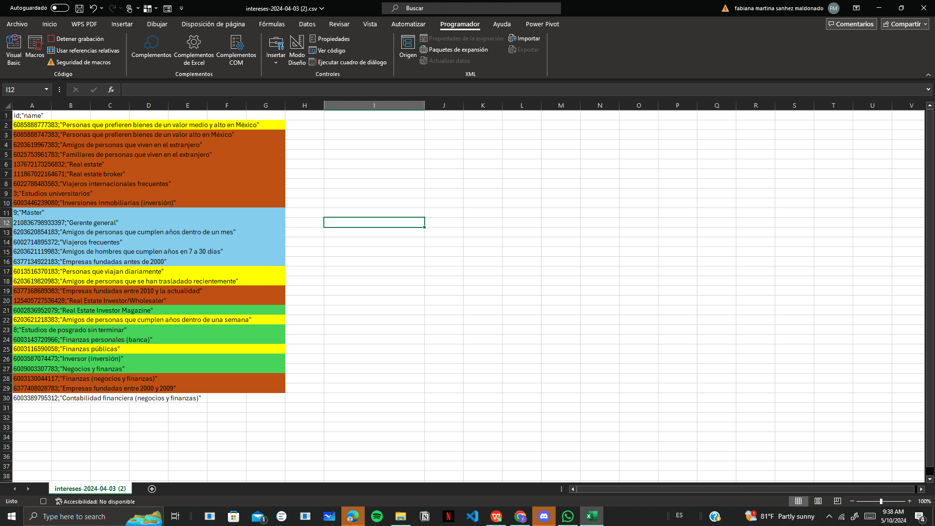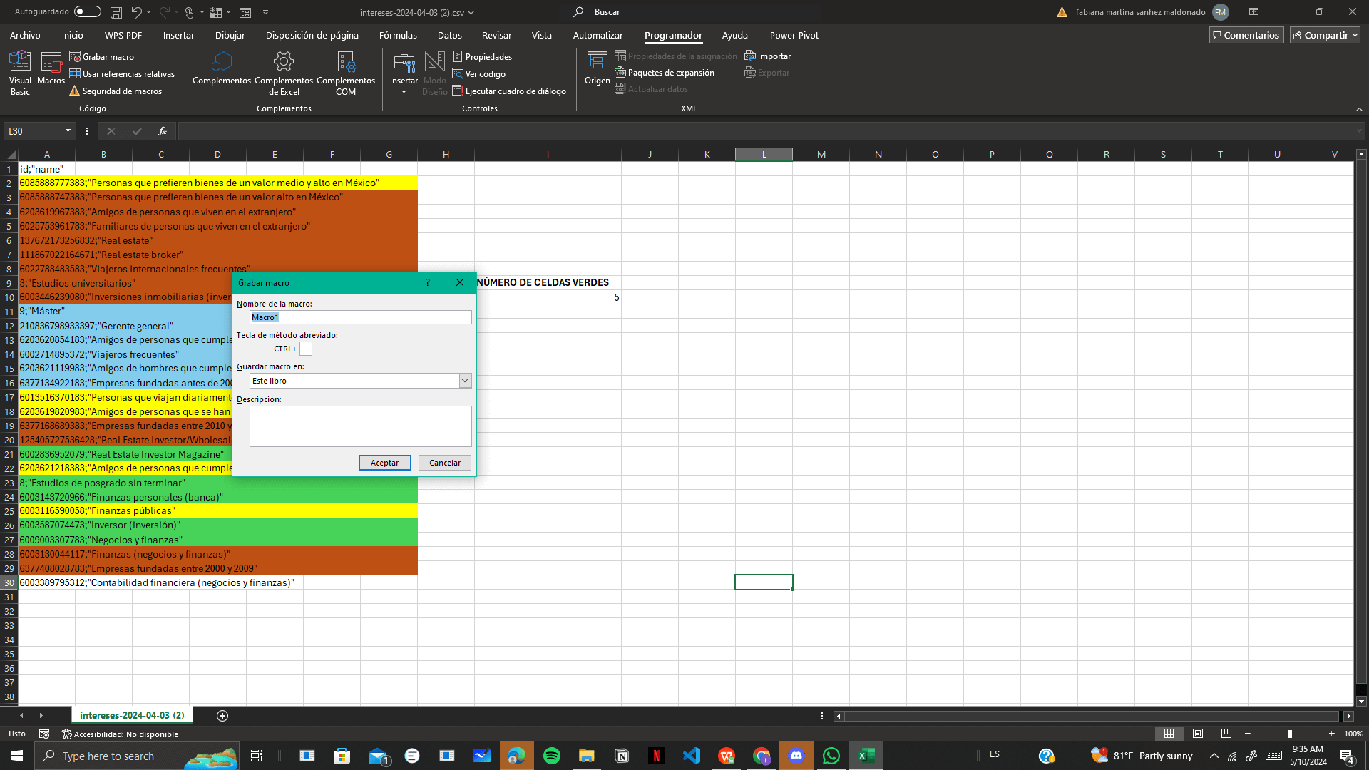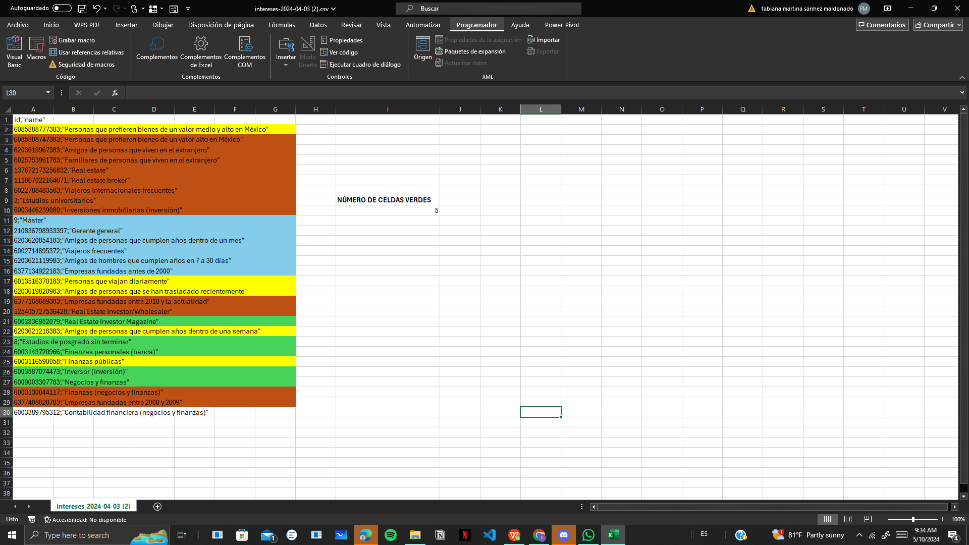 1. Una vez que hayas seleccionado las celdas por color, regresa a la pestaña programador y detenemos la grabación de macro.