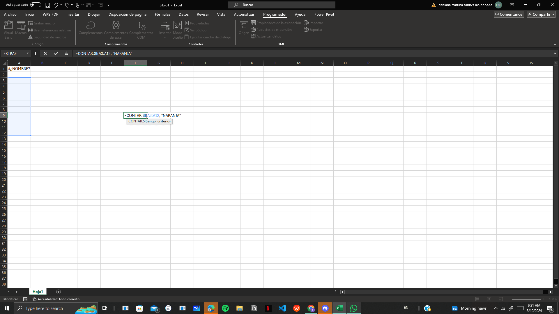 2. Escribe la fórmula:excel =CONTAR.SI(A1:A10, "verde")