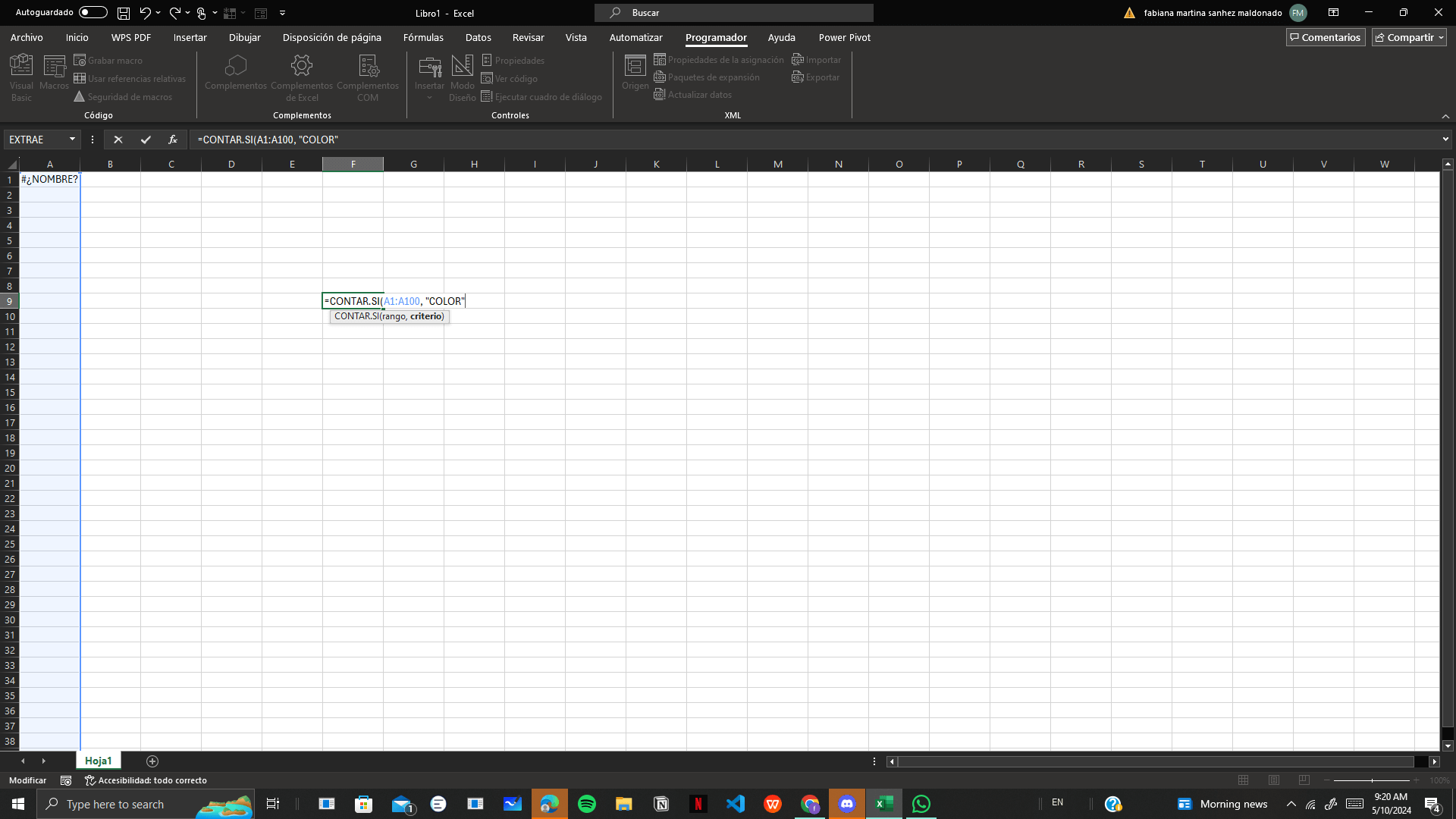 3. Presiona Enter para obtener el resultado del conteo. Esto te mostrará cuántas celdas en el rango A1:A10 son verdes.