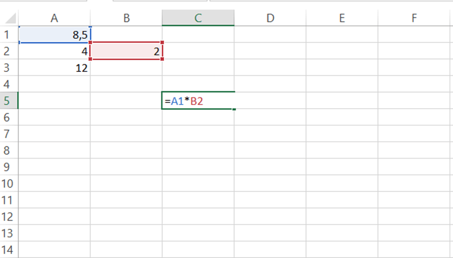 Para multiplicar el contenido de dos celdas específicas, escribe la fórmula de multiplicación con las referencias de celda adecuadas. En el siguiente ejemplo, verás la función de multiplicar en Excel aplicada a la celda A1, multiplicada por la cifra de la celda B2.