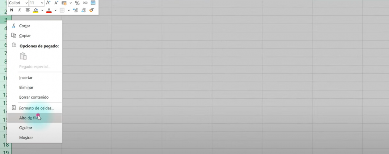 Del mismo modo, realizamos la misma operación a las filas. Pulsamos el botón derecho a todas las columnas y configuramos la altura de las celdas seleccionando la opción "Alto de fila" e introduciendo el valor numérico deseado para la altura de las filas. Esto nos permite personalizar el tamaño de las celdas según nuestras necesidades específicas.