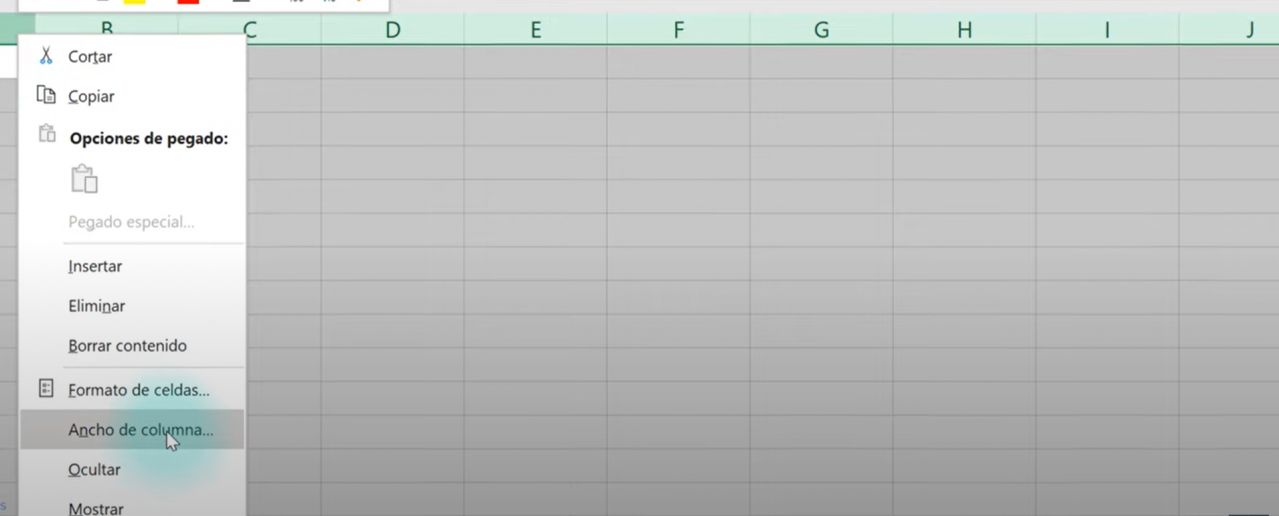 Para cambiar el tamaño de las celdas en Excel, necesitamos ajustar tanto el ancho de la columna como el alto de la fila. Esto se puede hacer haciendo clic con el botón derecho del ratón sobre cualquiera de las columnas y seleccionando la opción "Ancho de columna". Luego, establecemos el valor deseado para el ancho de las columnas. Este proceso se aplica a todas las celdas.