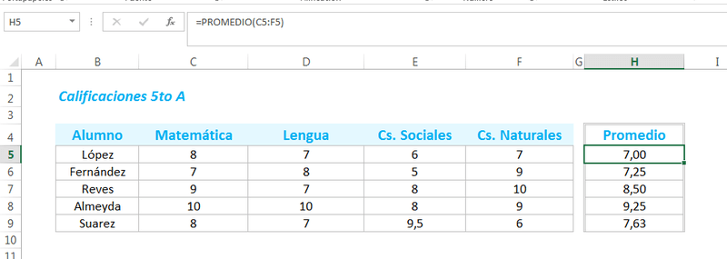 Fórmula de promedio básica en Excel: =AVERAGE()