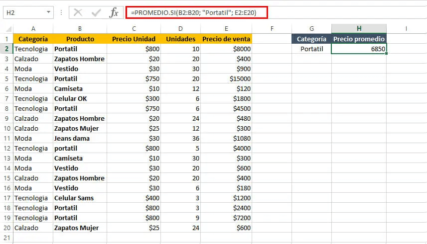 =AVERAGEIF(rango, criterio, [rango_promedio])