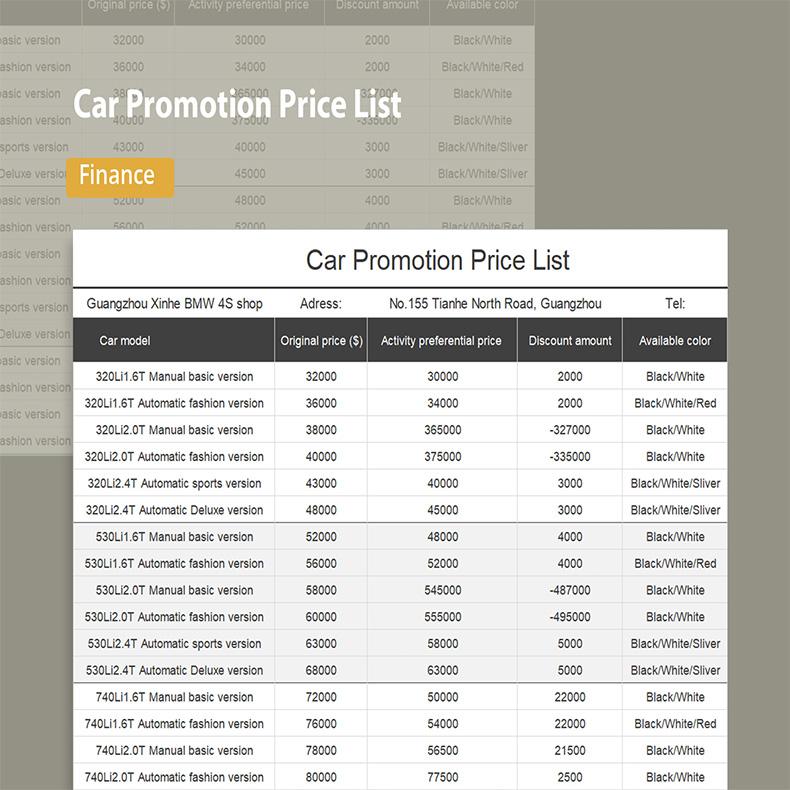 Esta plantilla se utiliza para hacer una lista de precios. Esta plantilla está especialmente diseñada para la promoción de vehículos, pero se puede utilizar en muchas ocasiones según la situación.