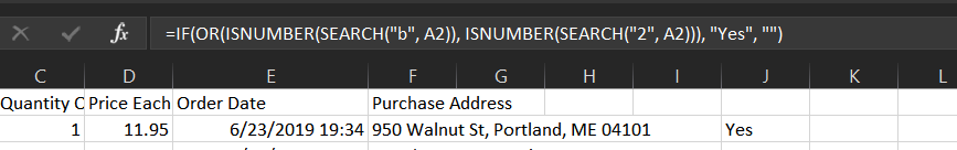 =IF(OR(ISNUMBER(SEARCH("b", A2)), ISNUMBER(SEARCH("2", A2))), "Yes", "")