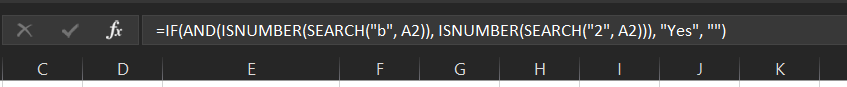 =IF(AND(ISNUMBER(SEARCH("b", A2)), ISNUMBER(SEARCH("2", A2))), "Yes", "")