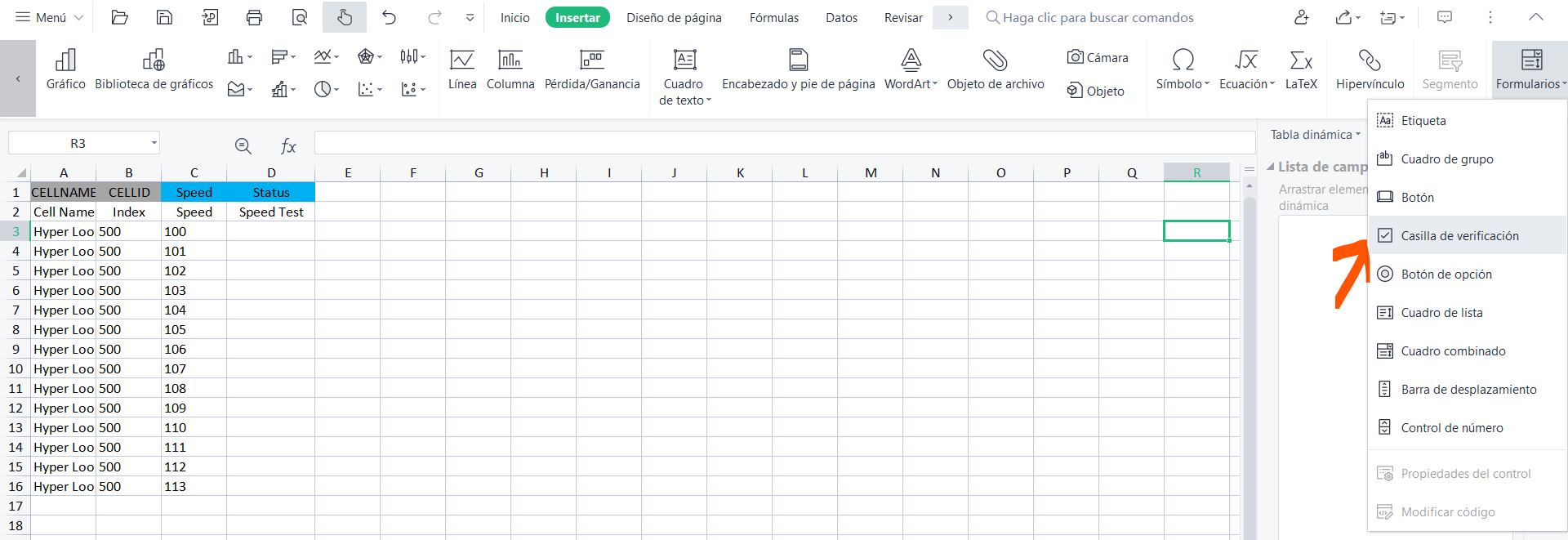 5. Haz clic en Casilla de verificación en el menú desplegable de Formularios y nuevamente haz clic en la celda donde se creará la casilla de verificación.
