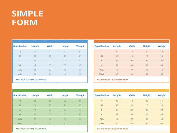 Esta plantilla en formato Excel se ha creado para adaptarse al departamento de fabricación. Puede ser usado por los diseñadores o el departamento de fabricación de la industria textil para insertar las tallas de los productos de S a XXXL. Esta plantilla puede ser utilizada por el usuario para insertar las tallas de cuatro productos diferentes.
