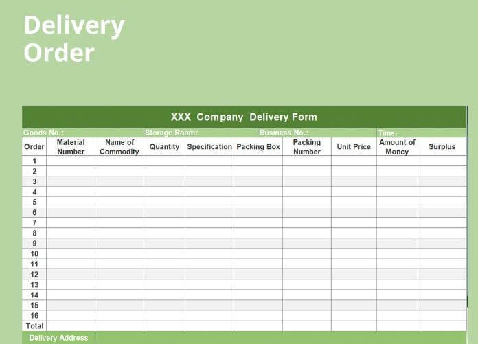 Una plantilla de pedido de entrega se utiliza como una solicitud por escrito para la autorización del transporte de la carga a otra parte por parte de un consignatario, propietario, o su agente de transporte de mercancías. Esta plantilla se crea para hacer un seguimiento de las órdenes.