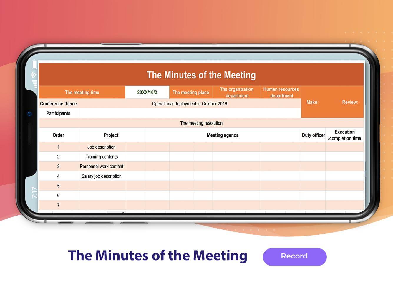 Utilice esta superincreíble plantilla a color y prepare su acta de reunión en formato Excel para recordar el orden del día de la reunión y lo que tiene que discutir en ella.