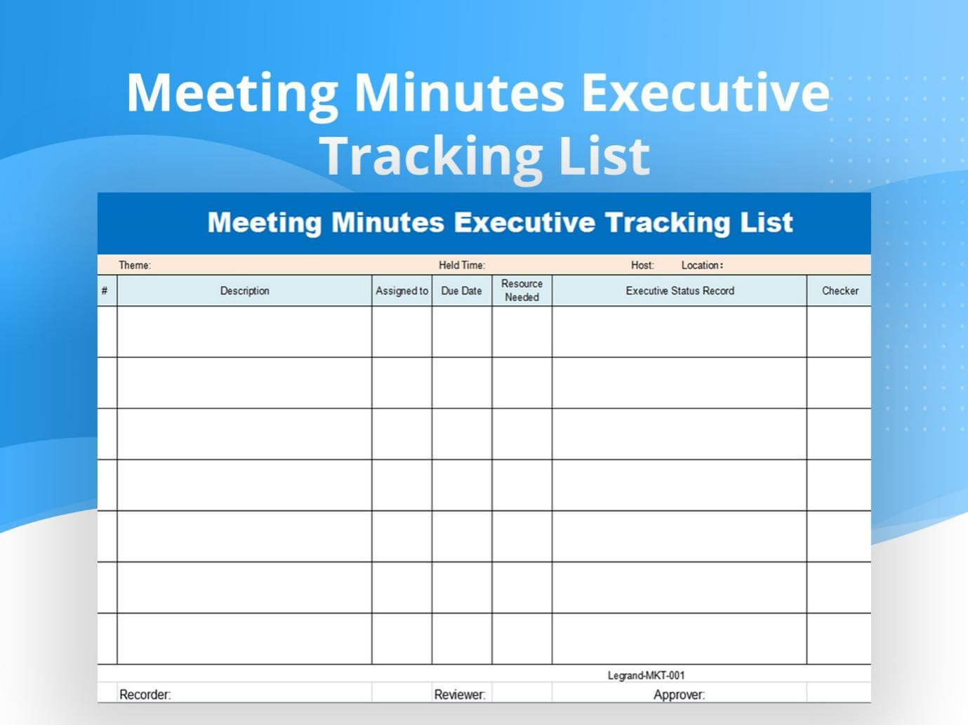 Esta es una plantilla minimalista de actas de reuniones fácil de descargar. Use esta cautivadora plantilla de lista de seguimiento ejecutivo en forma Excel para mantener el registro de las reuniones.