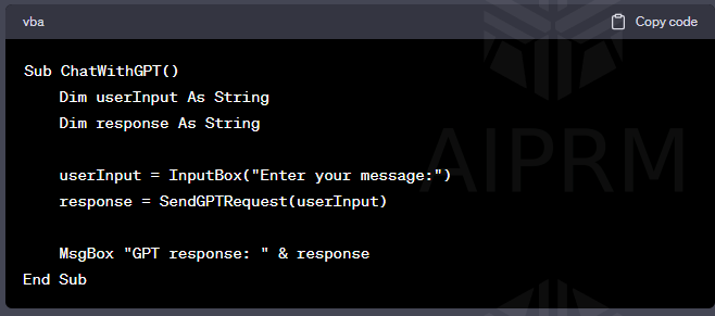 Esta macro pide al usuario que introduzca un mensaje, lo envía a la API de ChatGPT y muestra la respuesta en un cuadro de mensaje.