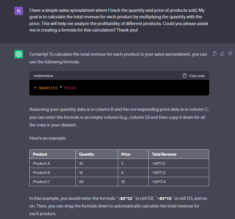 Usa la fórmula generada al instante: Para usar la fórmula generada, simplemente cópiala del panel de ChatGPT y pégala en la celda apropiada de tu hoja de cálculo de Excel una vez que estés satisfecho con ella. ¡Observa cómo ocurre la magia y tus cálculos cobran vida!
