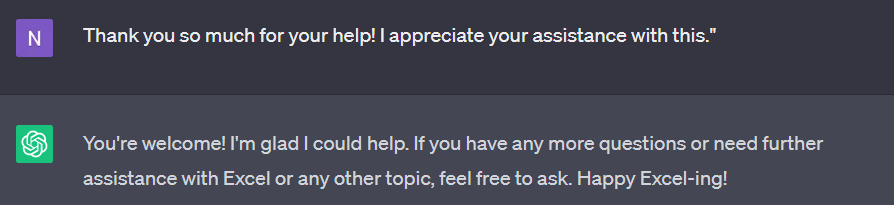 Aprende de cada interacción. Presta mucha atención a los comentarios y justificaciones de ChatGPT. Esto podría ayudarte a comprender mejor los temas de Excel y a mejorar tus habilidades con el tiempo.