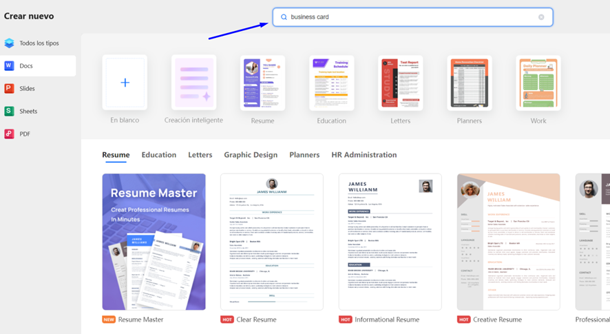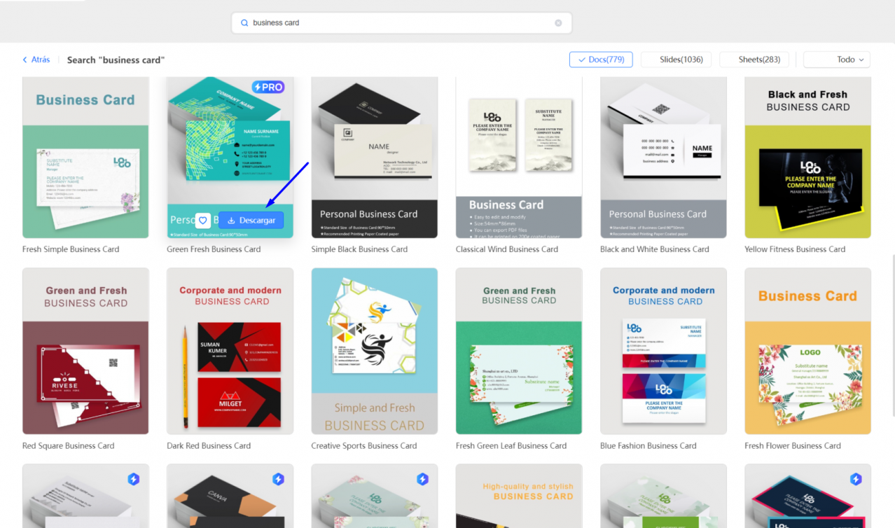 introduce el término ‘tarjeta de visita’, ‘tarjeta’ o ‘business card’ en la barra de búsqueda.