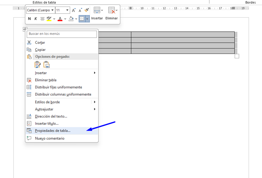 Ahora, pulsa sobre la esquina superior izquierda de la tabla con el botón derecho del ratón, y elige la opción ‘Propiedades de tabla’.