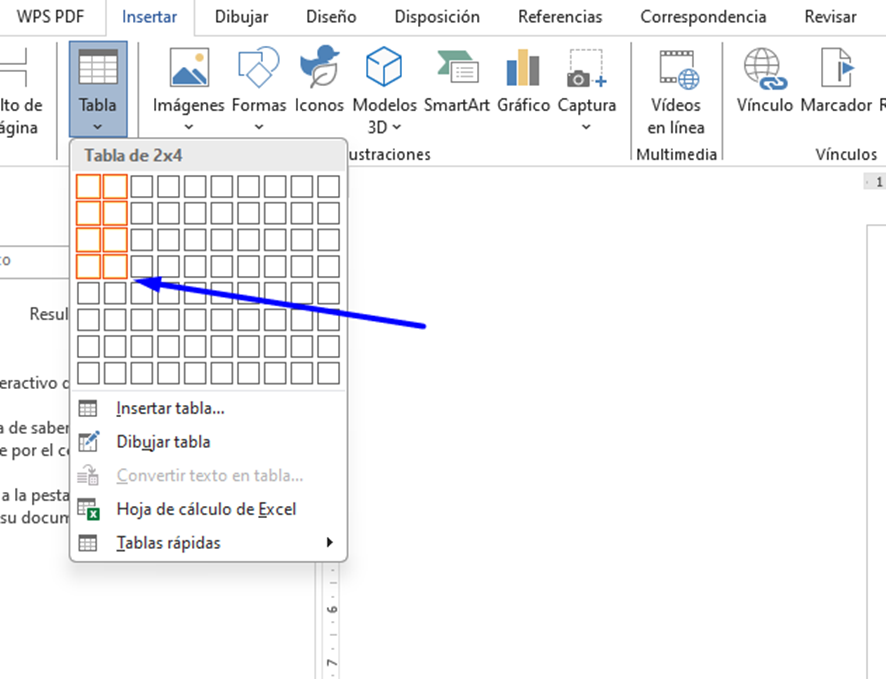 Ve entonces al menú ‘Insertar’, pulsa sobre la opción ‘Tabla’, y crea una tabla de 2x4.