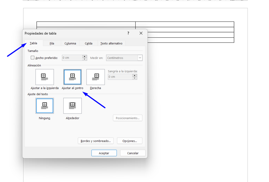 En la pestaña ‘Tabla’, pulsa sobre la opción ‘Ajustar al centro’.