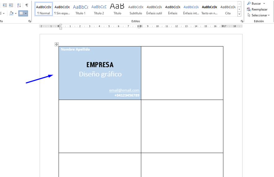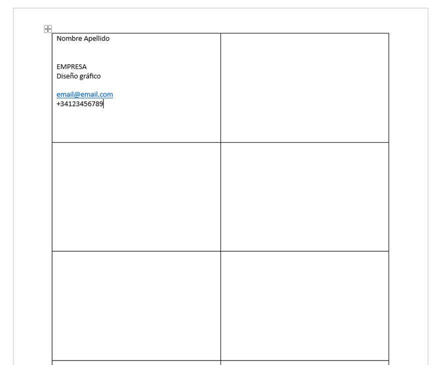 Ahora tendrás la plantilla de las tarjetas de visita en Word, lista para editarla. Puedes pulsar sobre cualquiera de los campos para introducir tu nombre, teléfono o correo electrónico.