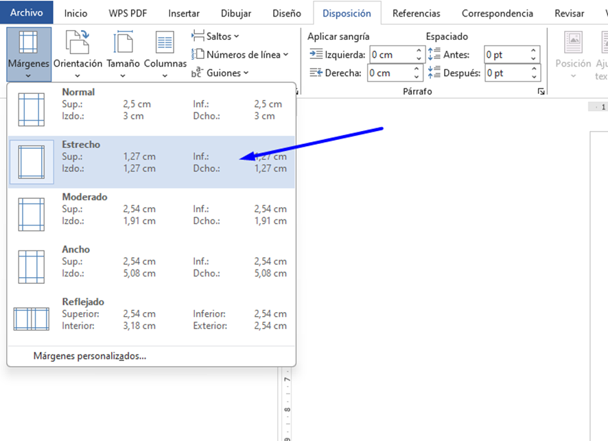 Si no encuentras ninguna plantilla que te guste, también puedes diseñar tus propias tarjetas desde cero con Microsoft Word. Para esto, crea un documento nuevo y comienza por ajustar los márgenes de la página en la opción ‘Estrecho’ que verás dentro del menú ‘Disposición’ > ‘Márgenes’.