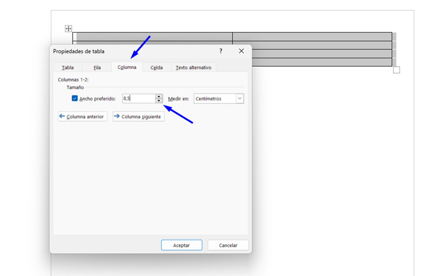 Haz lo mismo en la pestaña ‘Columna’, pero esta vez sitúa el ancho en 8,5 cm.