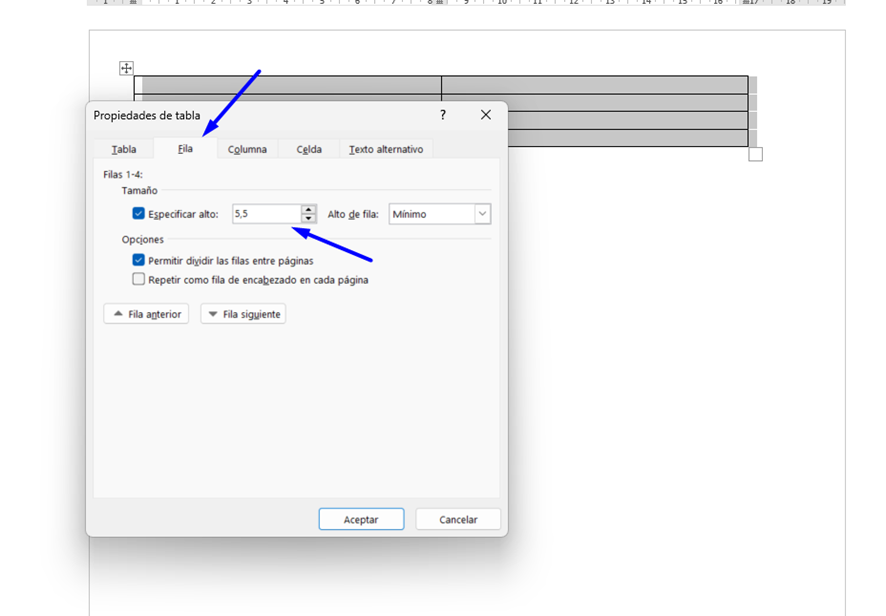 Luego ve a la pestaña ‘Fila’ y establece la altura en 5,5 cm.