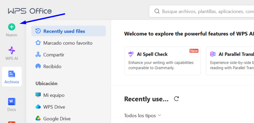 Para poder crear tus tarjetas de presentación con WPS Office a partir de plantillas, lo primero que debes hacer es pulsar el botón ‘Nuevo’ del menú principal.