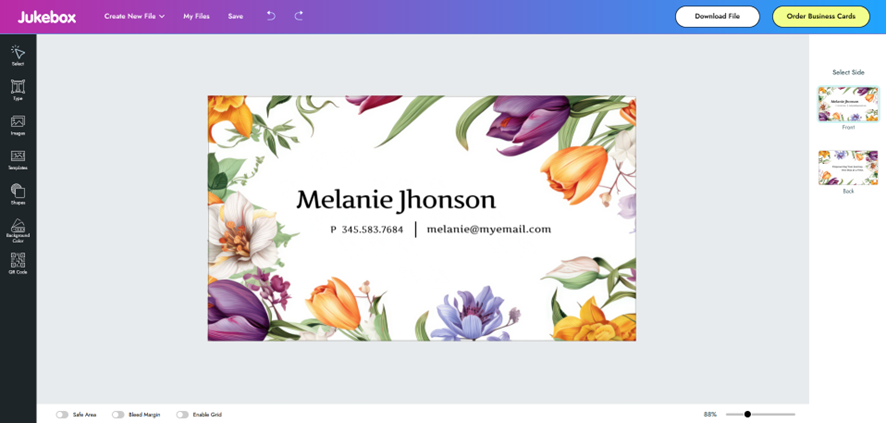 Finalmente tienes la opción de Jukebox, que te permite diseñar tus tarjetas de visita de forma gratuita, pero solo si las imprimes a través de su plataforma. Es decir, que el precio del diseño se encuentra incluido en el presupuesto que te harán a la hora de imprimir tus tarjetas y enviártelas a tu domicilio.