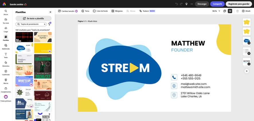 Algo similar ocurre con Adobe Express. Esta app de Adobe solo es gratuita hasta cierto punto, y sus funciones básicas son muy limitadas. Como en el caso de Canva, Adobe Express te permite editar tus plantillas de tarjetas de presentación desde un navegador web, pero tendrás que pagar su costosa suscripción Premium para poder acceder a sus mejores plantillas.