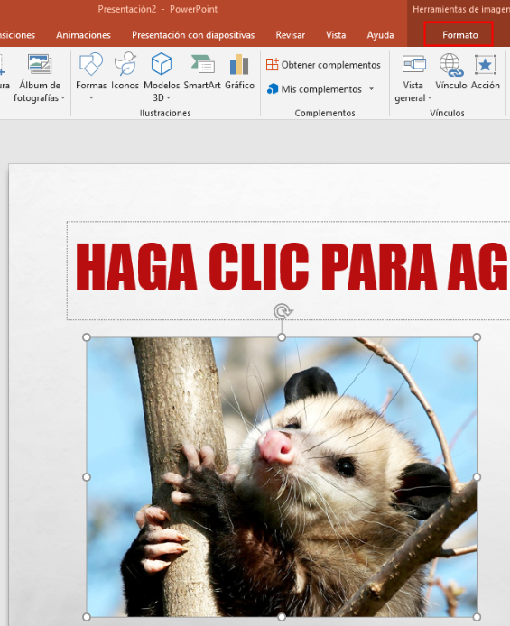 Selecciona la imagen: Una vez que la imagen esté cargada en la diapositiva, haz clic sobre ella para seleccionarla.