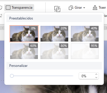Control de transparencia personalizado: WPS Office te permite ajustar la transparencia de las imágenes de forma precisa mediante una barra deslizante o puedes usar los valores preestablecidos.