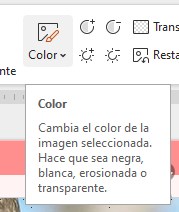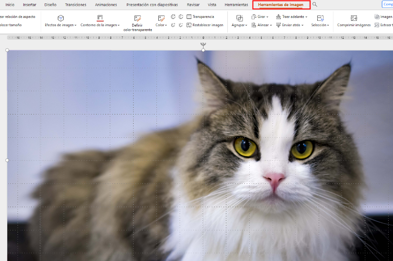 Opciones de formato: Una vez que la imagen esté insertada en la diapositiva, haz clic en ella para seleccionarla y accede a la opción “Herramientas de formato” ubicado en la parte de arriba