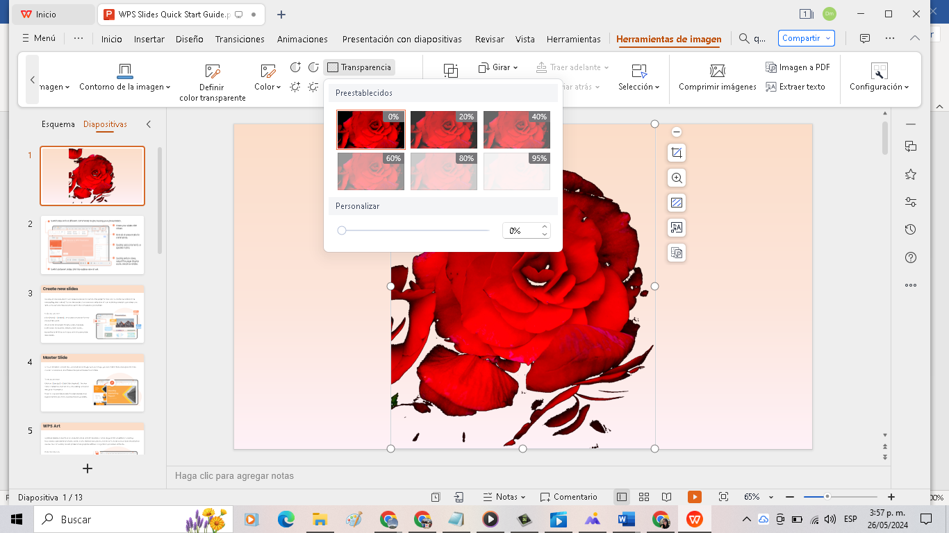 La transparencia es una herramienta que puedes usar para ajustar la opacidad de una imagen, esto te permite diseñar tus diapositivas con un fondo transparente y poder fusionarla con la presentación.