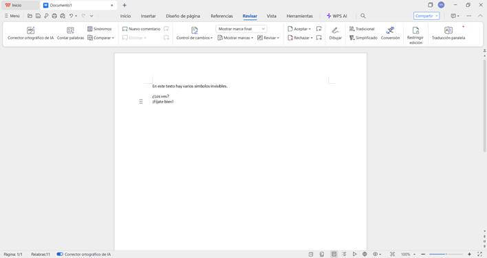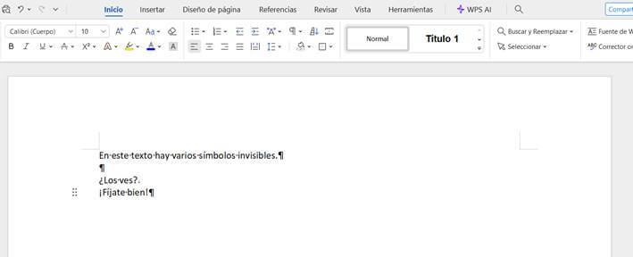Vamos a comenzar con WPS Writer. Como decíamos, en un texto normal lo habitual es que los caracteres invisibles no estén a la vista.