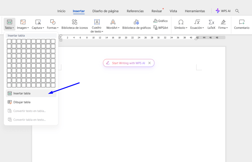 Para hacer un crucigrama con WPS Office, crea un documento nuevo E inserta una tabla pulsando la pestaña de 'Insertar', luego el botón 'Tabla', y finalmente la opción 'Insertar tabla'.