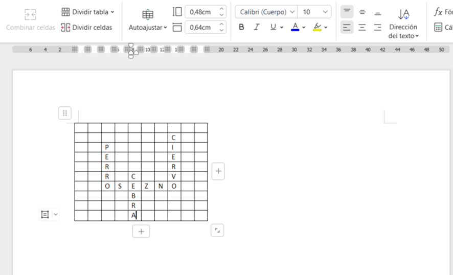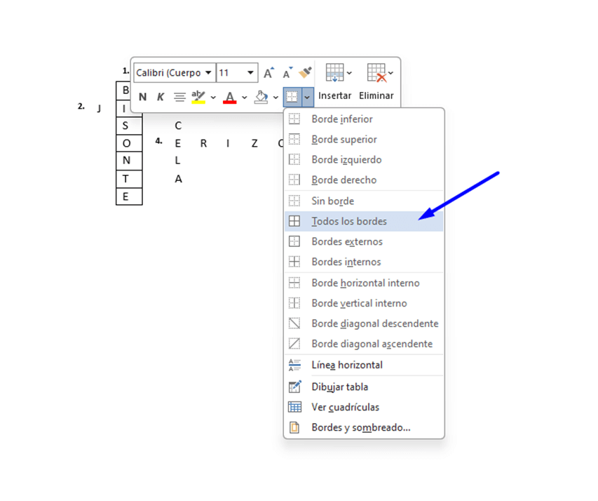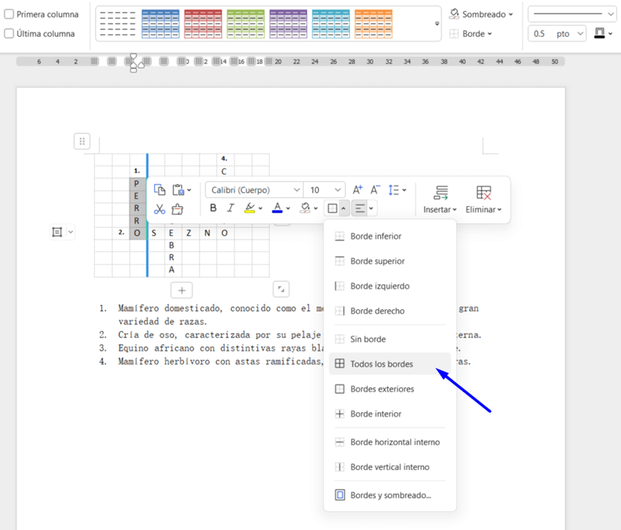 Finalmente, debemos seleccionar cada palabra de nuestro crucigrama para restablecer sus bordes. Esto se hace pulsando sobre el botón derecho encima de la palabra seleccionada, haciendo clic en el menú de bordes de tabla, y eligiendo la opción 'Todos los bordes'.