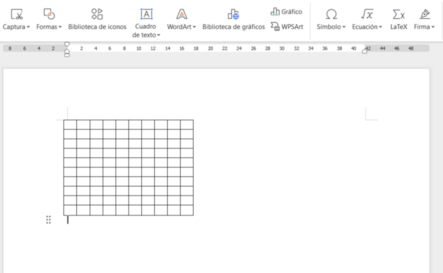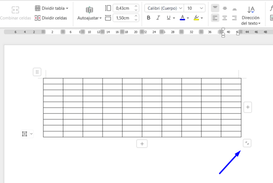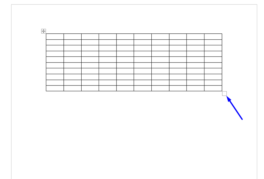 El resultado será una tabla con el número de filas y celdas que decidas. En este caso hemos optado por una tabla de 10 x 10. Como las celdas son demasiado horizontales, vamos a cambiar las proporciones de la tabla arrastrando la esquina inferior derecha.